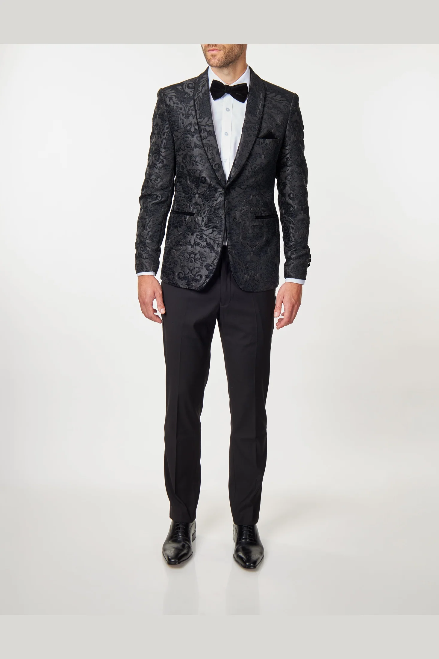 GLEN - Black Floral Foliage Jacquard Tuxedo Jacket