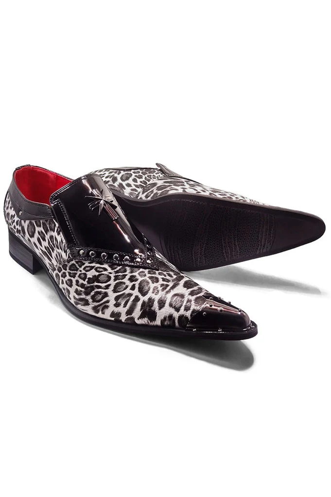Make a bold fashion statement with our LIVIO Men's Black Shiny Patent Faux Leather Leopard Print Loafer Winkle Pickers, featuring a striking metal toe and studded accents. These eye-catching shoes combine the sleek shine of black patent faux leather with a wild leopard print, creating a unique and edgy look. The pointed winkle picker silhouette adds a touch of rock 'n' roll flair, while the metal toe cap and studs bring an extra layer of attitude.