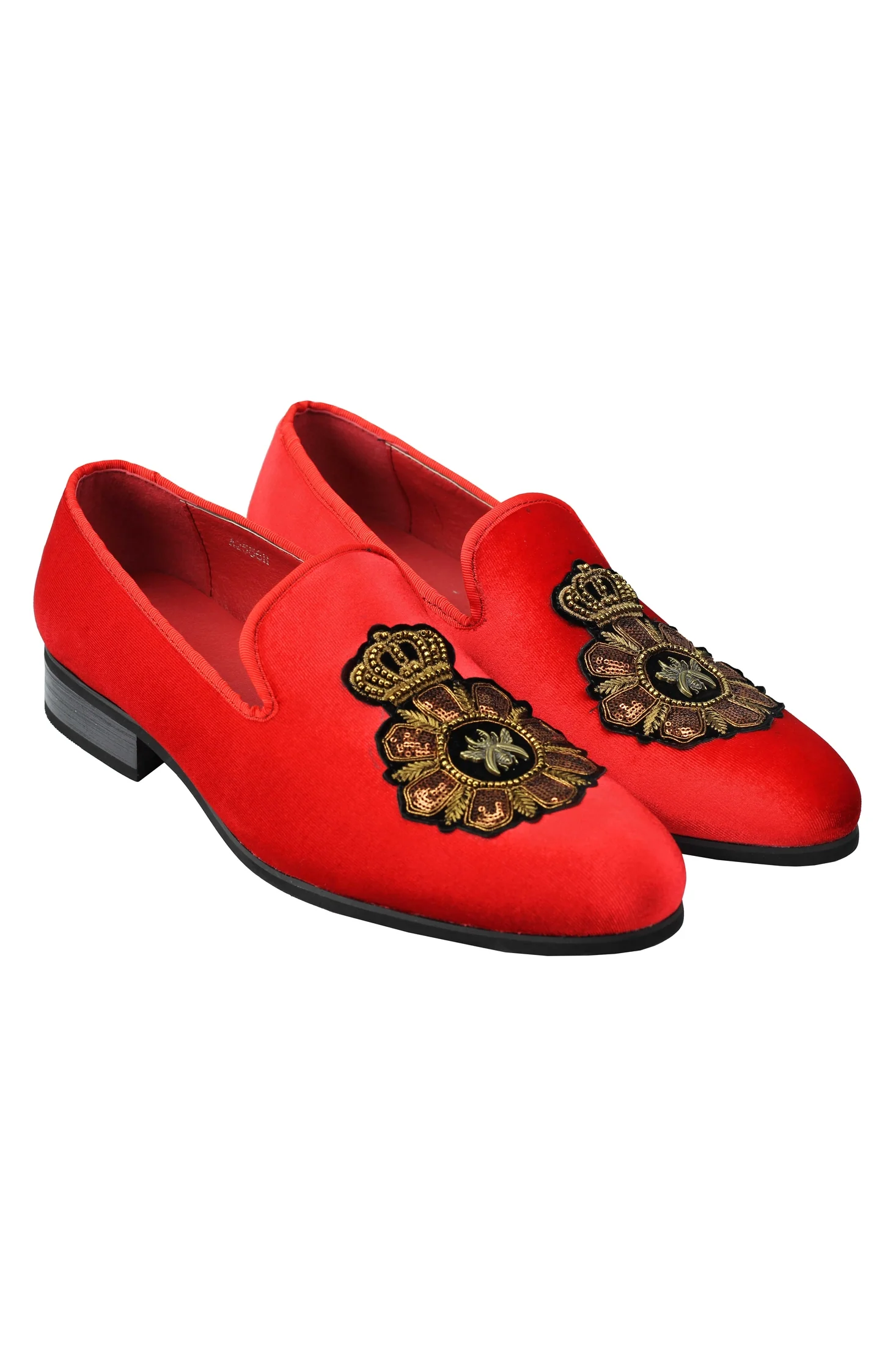 FAUX LEATHER EMBROIDERED VELVET LOAFERS IN RED